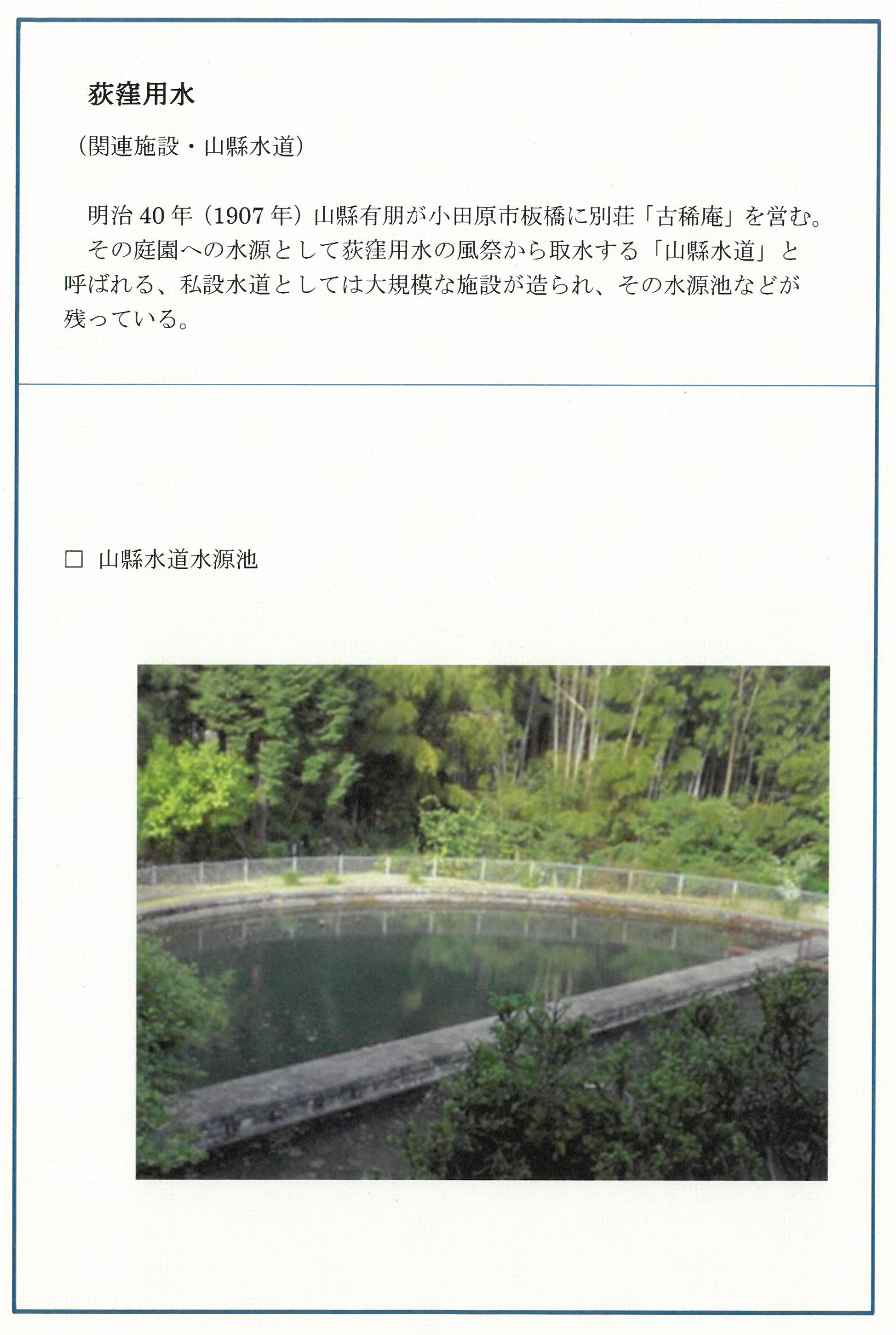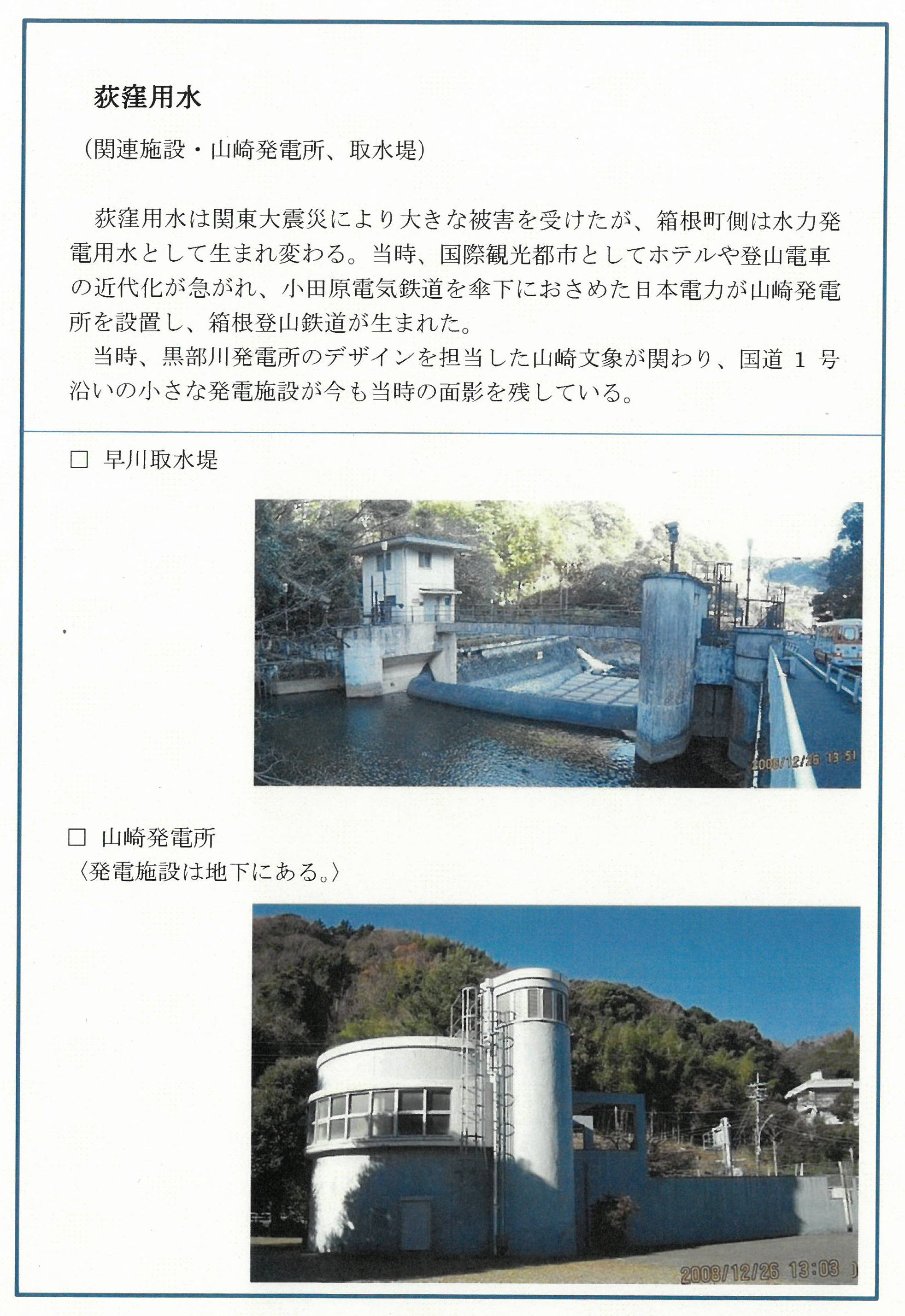 関連施設として明治後期 (1909 年)、 山縣有朋が個人用水道としては大規模な「山縣水道」を引き、 昭和初期(1936年)には国際観光地箱根の開発に大きく貢献する「山崎発電所」が設置され、 ともに当時の土木施設として良く保全されており、 用水本体とともに地域資源として後世に保全する必要がある。