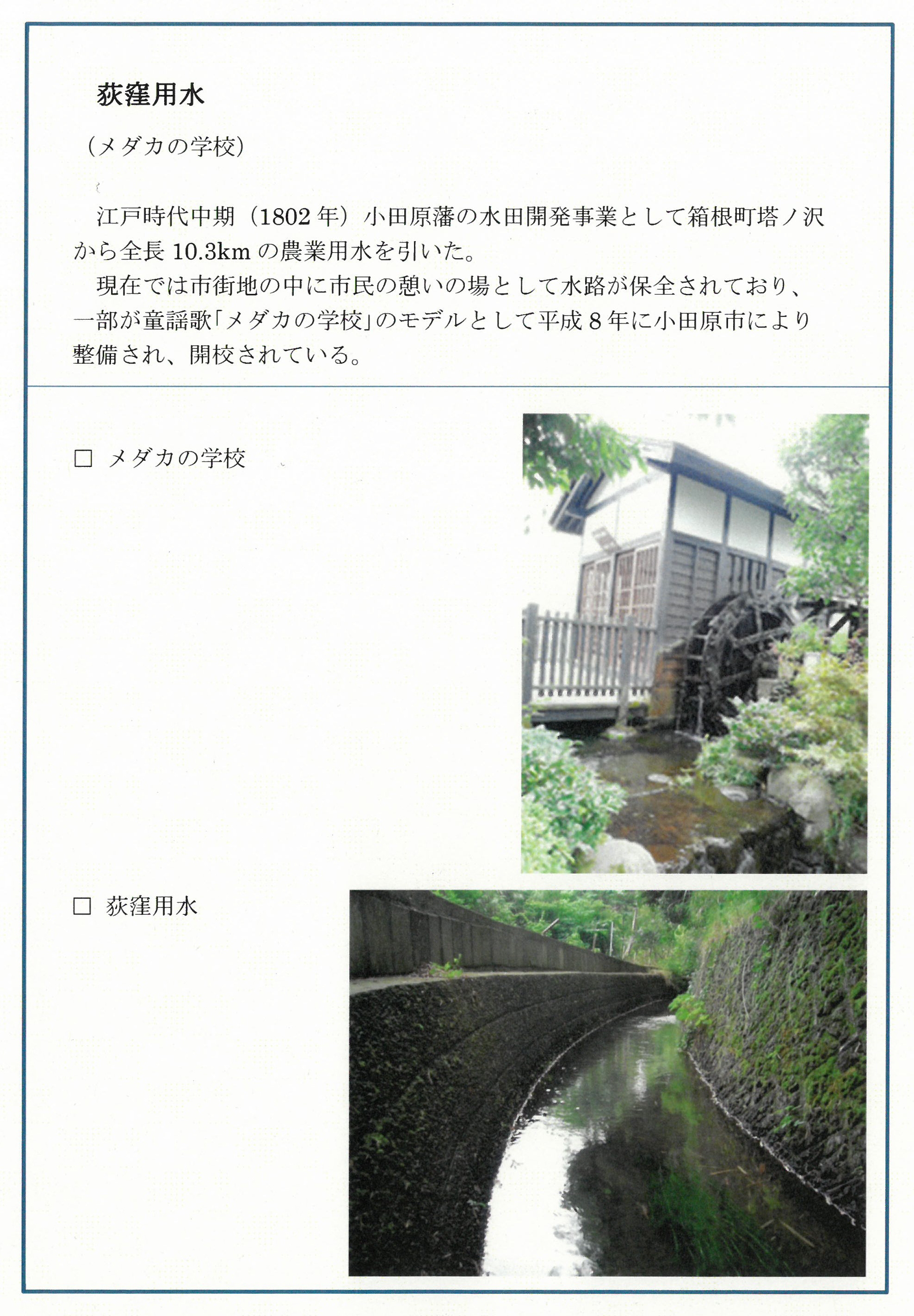 - 江戸中期小田原市の水田開発事業として開かれ、 現在はその水路がよく保全され、 市民の散策やレクリエーションの場としても親しまれており、 童謡歌「めだかの学校」が生まれた場所でもある。