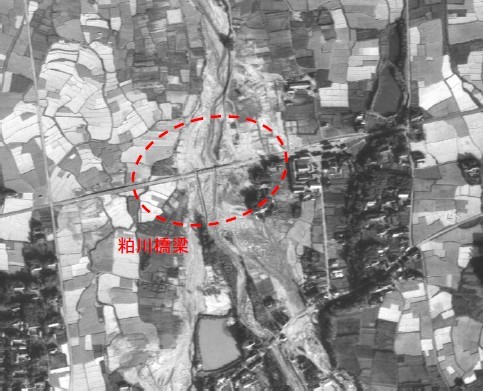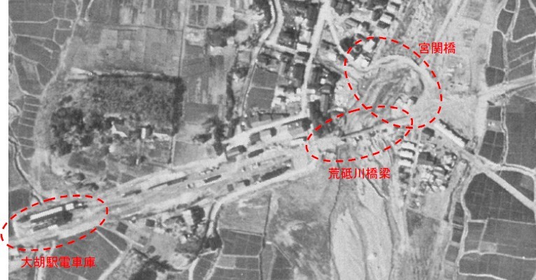 写真24 (参考)カスリーン台風被災・復旧状況写真(「大胡町水難誌」より) (昭和23年撮影航空写真)復旧した上電荒砥川橋梁と付替仮設道路の宮関橋(道路橋)
