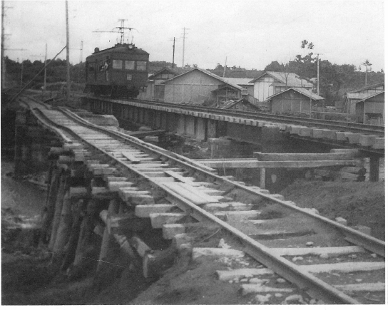 写真22 (参考)カスリーン台風被災・復旧状況写真(「大胡町水難誌」より) (荒砥川橋梁)復旧した上電鉄橋(手前は仮設)