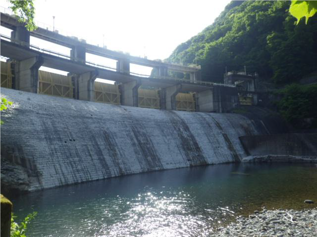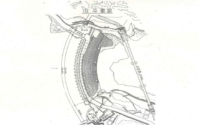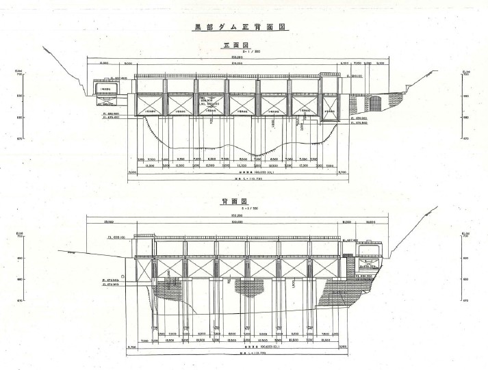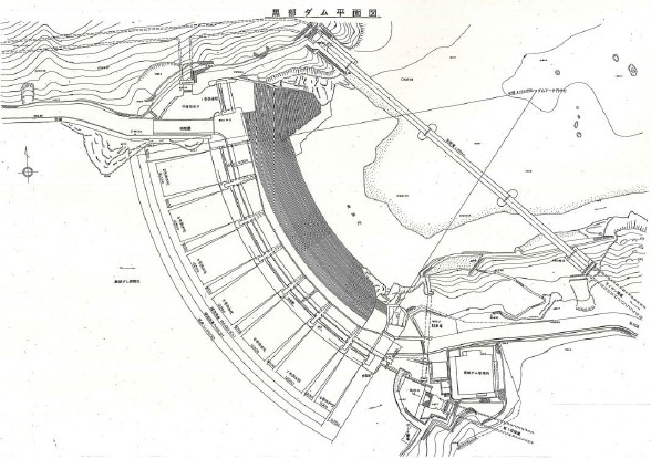 黒部ダムの構造上の特徴は、半径121mのアーチ型の平面形状を有し、また越流部に15mの長い水平部を有していることが挙げられる。また、堤体材料は、河床の玉石を用いた粗石コンクリートで、表面には0.09〜0.2㎥の大きさに加工した石材を畳積みにした張石工が施された。諸元は、堤高33.91m・堤頂長150m・洪水吐き22門・堤体積80,542㎡である。