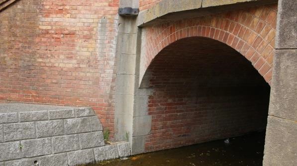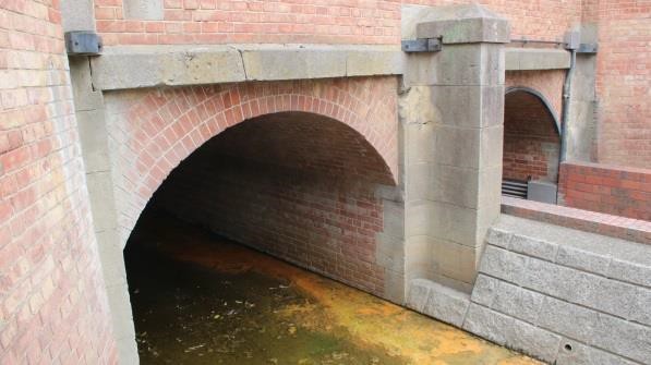 千貫樋の樋表(荒川側)を望む。向かって左側の樋管が常時の水路で、右側はくぐり抜け可能の遊歩道である。樋管に増工した公園施設は、水路護岸・左翼壁(向かって右)袖壁・遊歩道土留である。