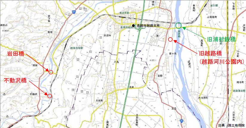 | 岩田橋:新潟県長岡市岩田・不動沢橋:新潟県長岡市不動沢・旧越路橋:新潟県長岡市浦(越路河川公園内) |