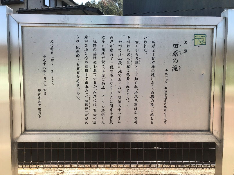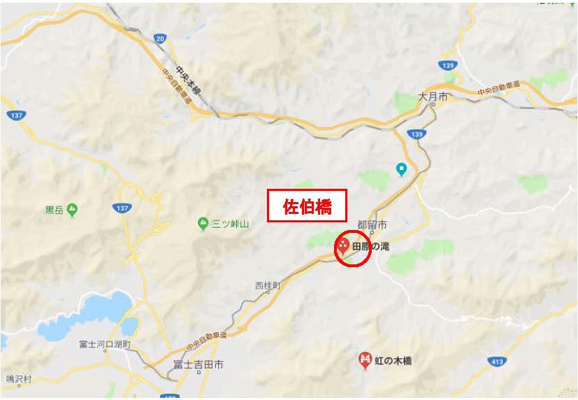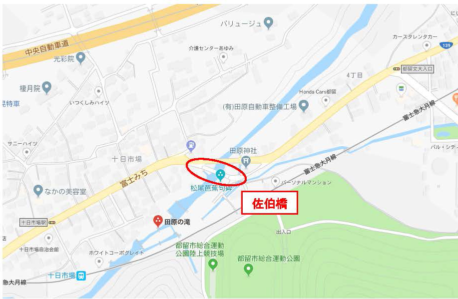 佐伯橋付近は、かつて松尾芭蕉が立ち寄り、白くしぶきを上げて流れる田原の滝の様子を「勢ひあり 氷消えては 瀧津魚(たきつうお)」と読んだ景勝地であり、すぐ脇には地元の農業に大きな役目を果たした谷村大堰が流れるなど、都留市もこれまで佐伯橋を含む田原の滝周辺を公園化し観光名所として整備を進めてきた。