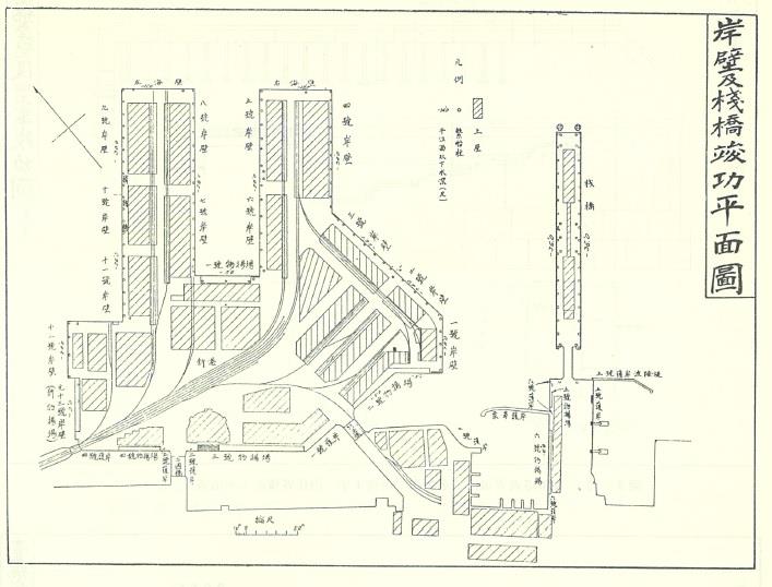 岸壁及桟橋竣功平面図(横浜港震害復旧工事報告:昭和4 年 内務省横浜土木出張所)より)